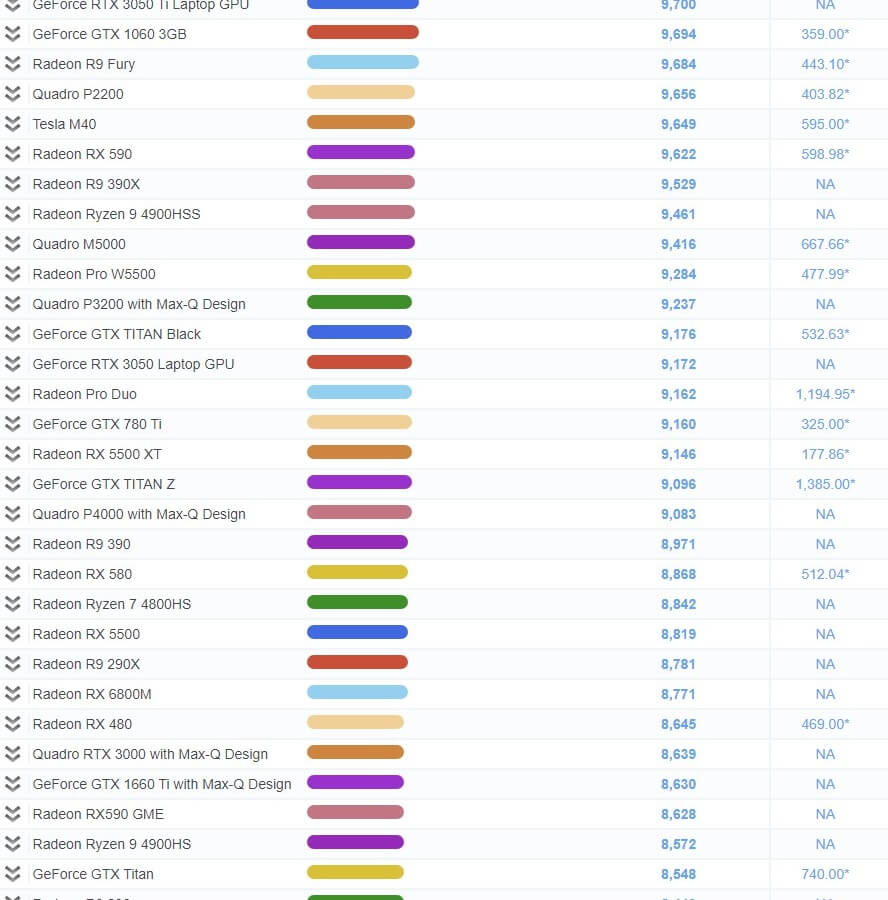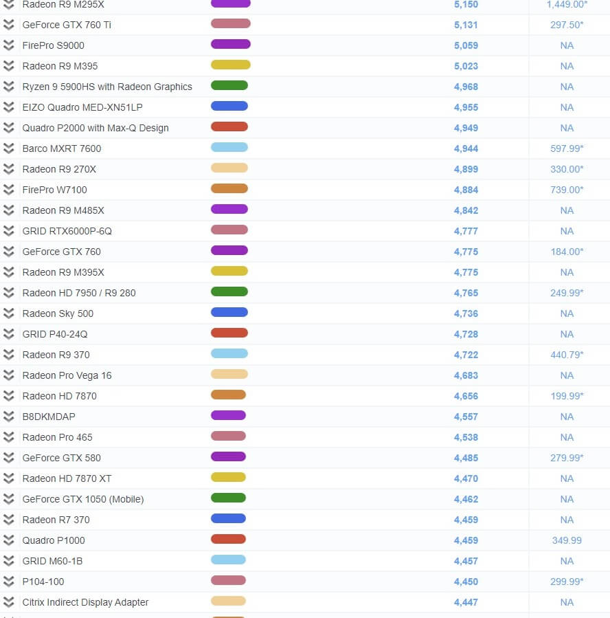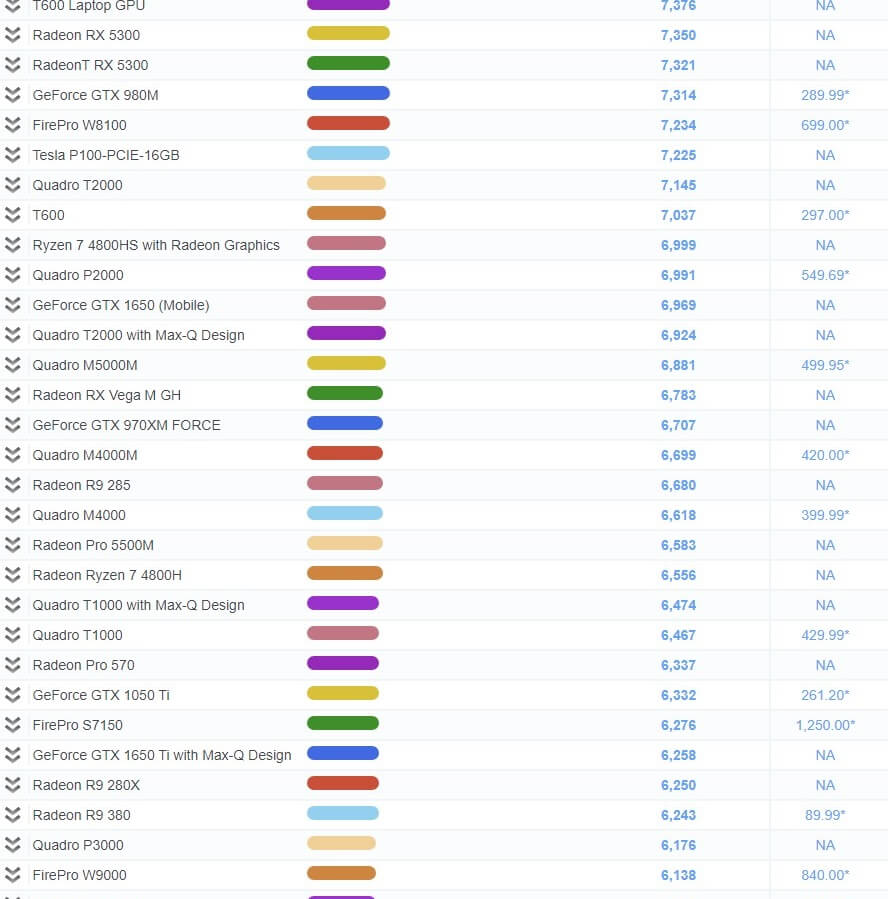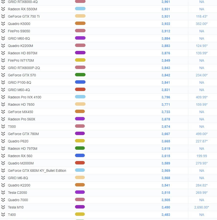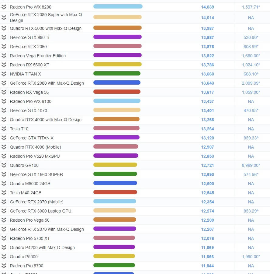 | 44 | Radeon Pro W5700 | 15,170 | 1,109.99* |