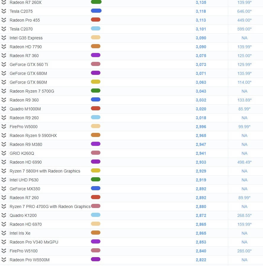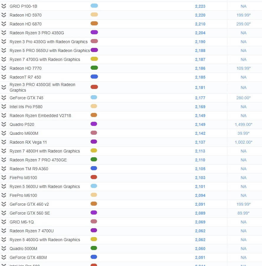 | 482 | Radeon HD 7770 | 2,186 | 109.99* |