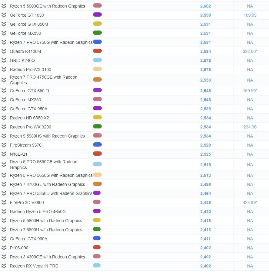 | 490 | Radeon RX Vega 11 | 2,137 | 1,002.00* |