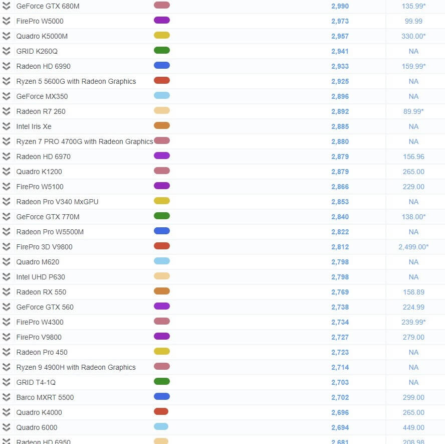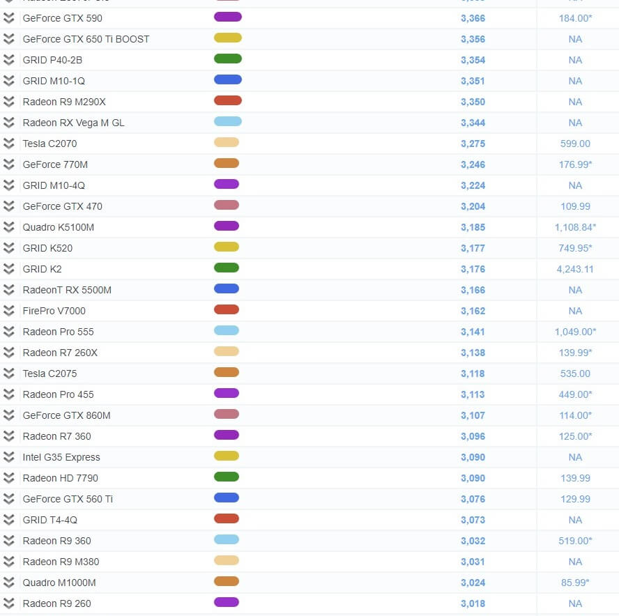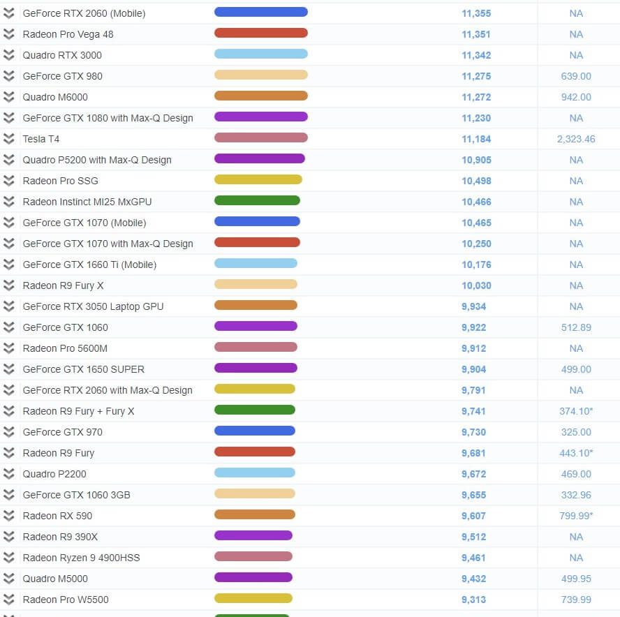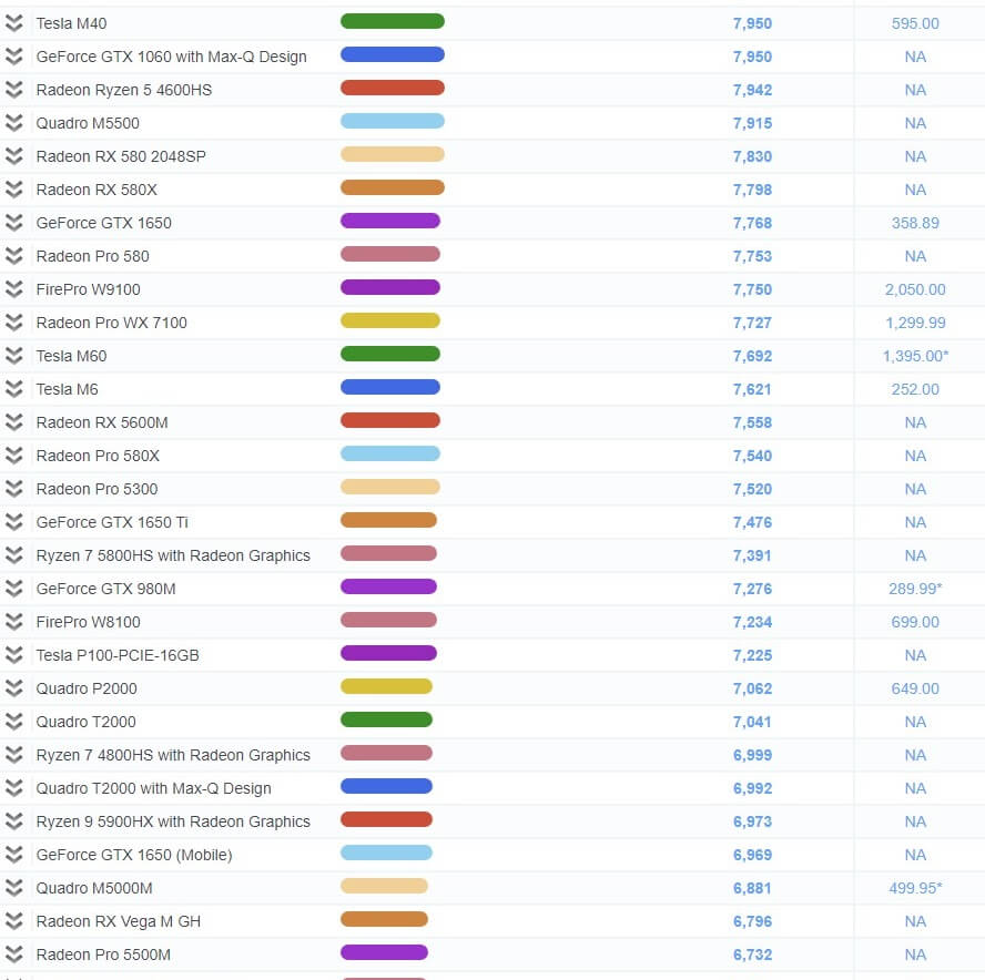 | 41 | Radeon Pro W5700 | 15,040 | 1,498.99 |
