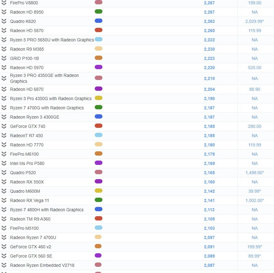 | 52 | Radeon Pro WX 8200 | 13,893 | 1,549.99 |