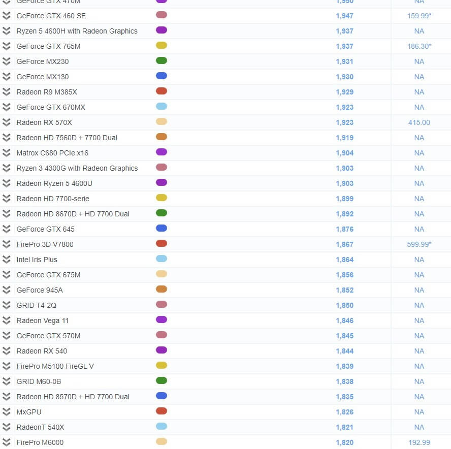 | 17 | Radeon RX 6700 XT | 18,836 | 1,243.00 |