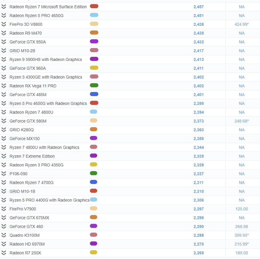 | 489 | Radeon R7 450 | 1,968 | 52.49* |