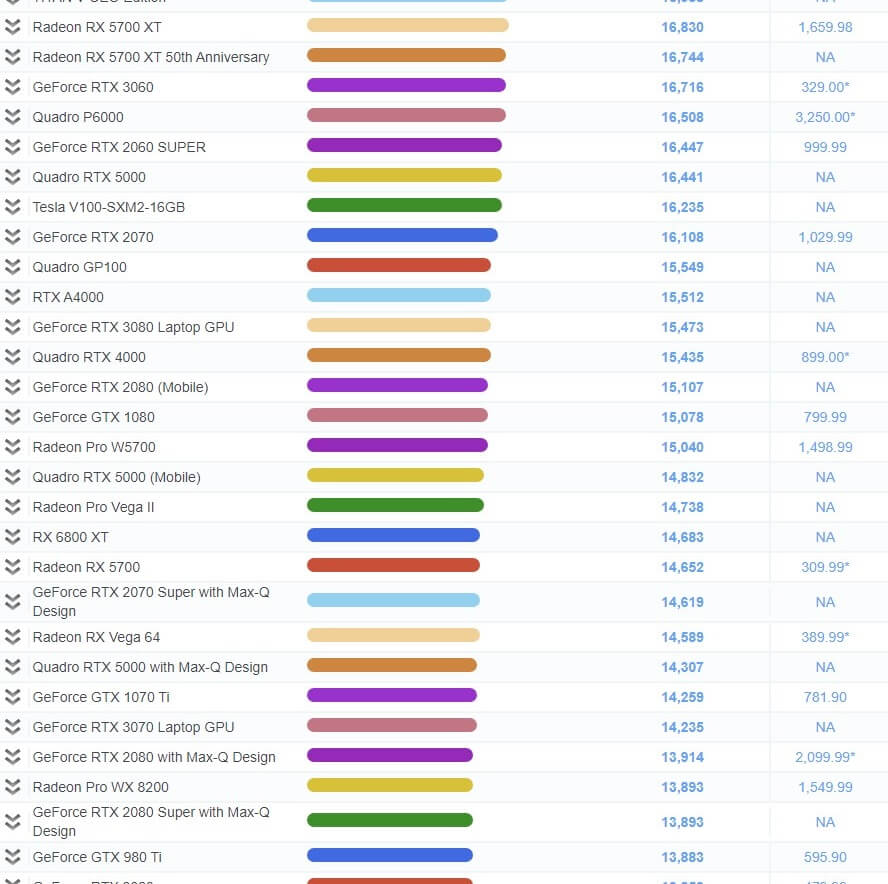 | 17 | Radeon RX 6700 XT | 18,836 | 1,243.00 |