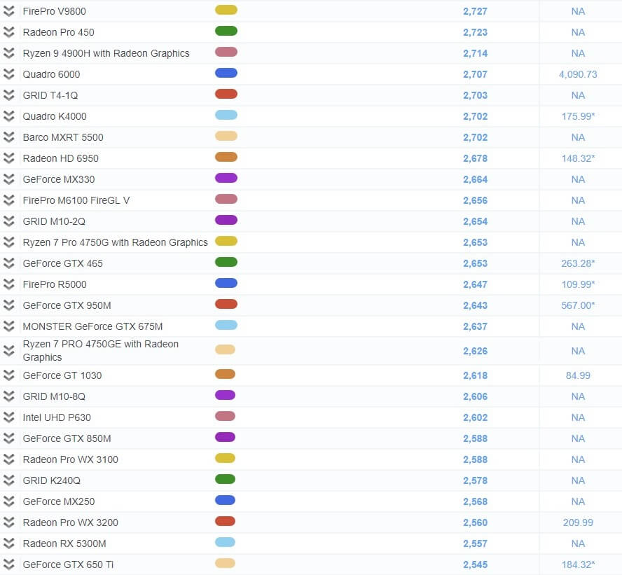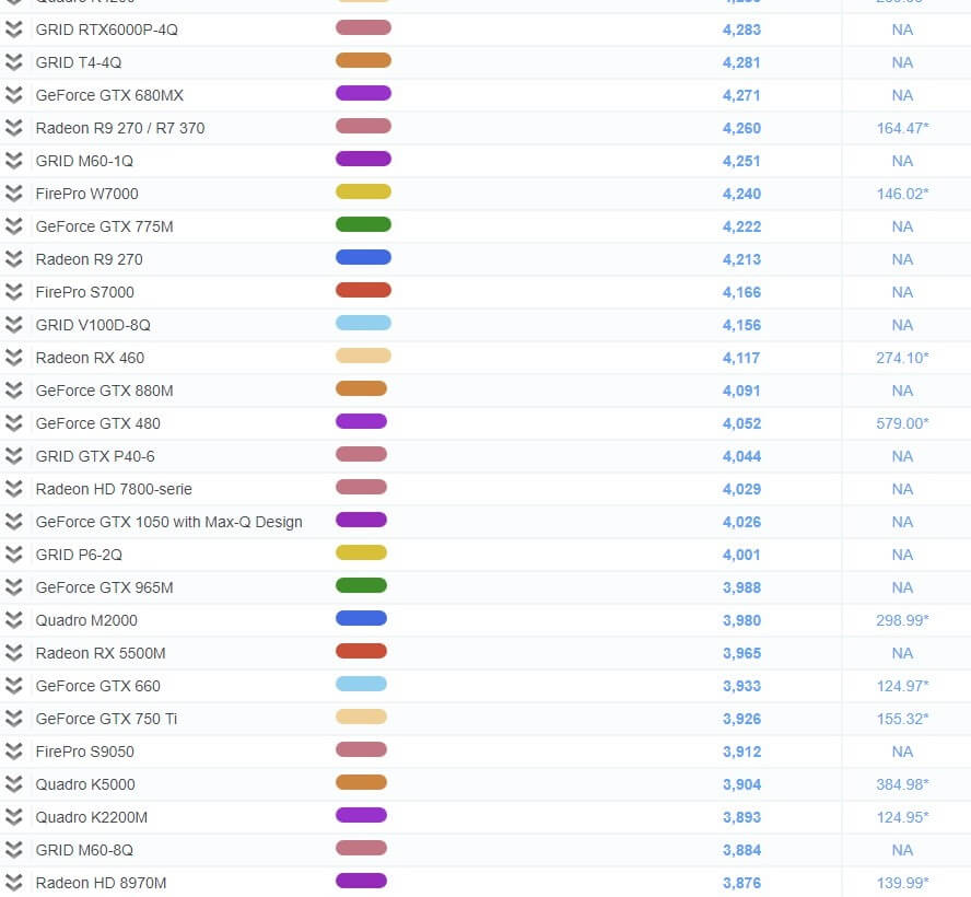 테이블정보 가독성을 위해서 그래픽 카드 성능 순위 비교표를 테이블화 하여 제공합니다.