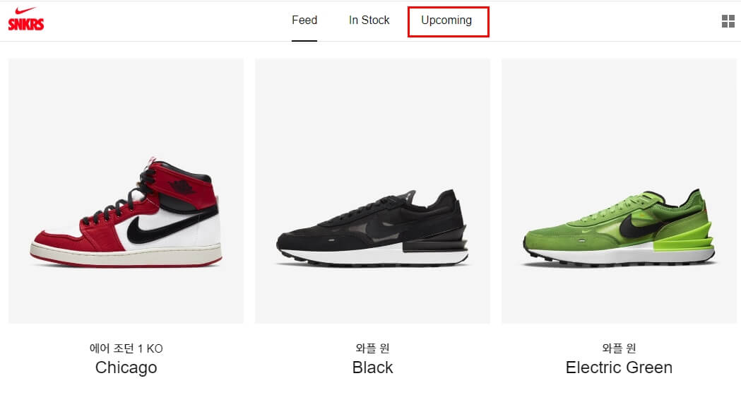 해당 페이지에서 크게 3가지로 구분이 됩니다. 그 중에서 upcoming 메뉴를 선택하시면 곧 나이키 온라인 스토어에서 응모를 진행예정인 제품을 확인 할 수 있습니다.