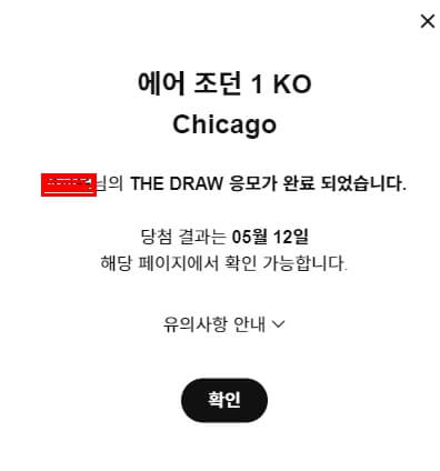 이와 같은 방법으로 에어 조던 1Ko Chicago 제품을 응모를 진행하였고, 응모 여부를 다음과 같이 확인 할 수 있는 팝업이 노출 됩니다. 그리고 당첨 결과 또한 바로 나오기 때문에 만약 당첨 될 경우 지정된 시간에해당 제품을 구매해야합니다.