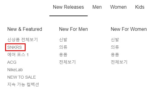 본격적으로 나이키 온라인 스토어 사이트를 통해서 응모하는 방법을 확인해보겠습니다. 상단에 있는 New Releases 메뉴를 선택하면 하위에 SNKRS 메뉴가 노출 되는 것을 확인 할 수 있습니다. 해당 메뉴를 클릭해주시면 응모할 수 있는 제품군을 확인 할 수 있는 페이지로 이동하게 됩니다.