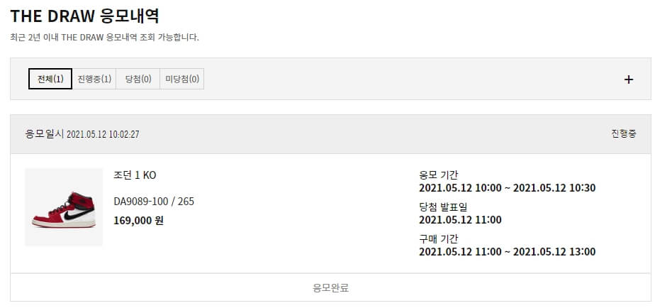 이와 같은 방법으로 에어 조던 1Ko Chicago 제품을 응모를 진행하였고, 응모 여부를 다음과 같이 확인 할 수 있는 팝업이 노출 됩니다. 그리고 당첨 결과 또한 바로 나오기 때문에 만약 당첨 될 경우 지정된 시간에해당 제품을 구매해야합니다.