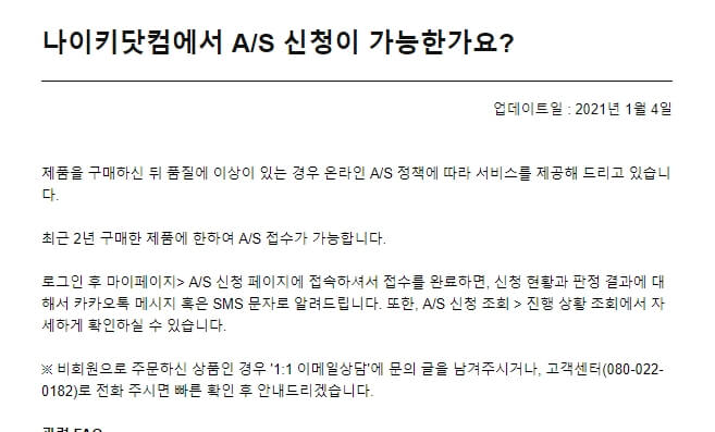 여러가지 질문 중에서 해당 질문이 가장 많은 분이 궁금해 할 정보라고 판단되어서 확인해보았습니다. 다른 일반적인 가전 제품과 동일하게 해당 제품 군에도 2년 구매한 제품에 대해서 나이키 AS 센터에서 해당 서비스를 이용 할수 있다고 명시하고 있습니다.