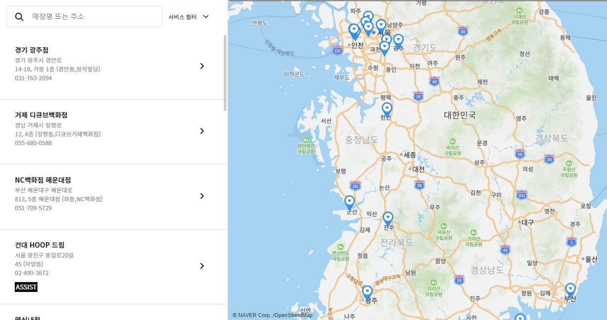 | 분당 서현점 | 경기 성남시 분당구 분당로53번길 | 9 (서현동 269-6) | 031-701-8753 | ASSIST |