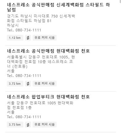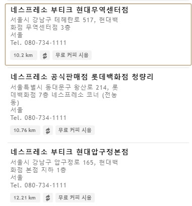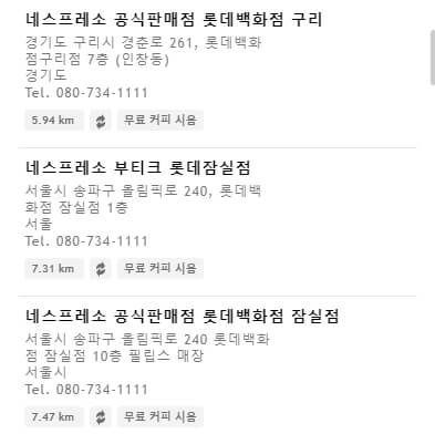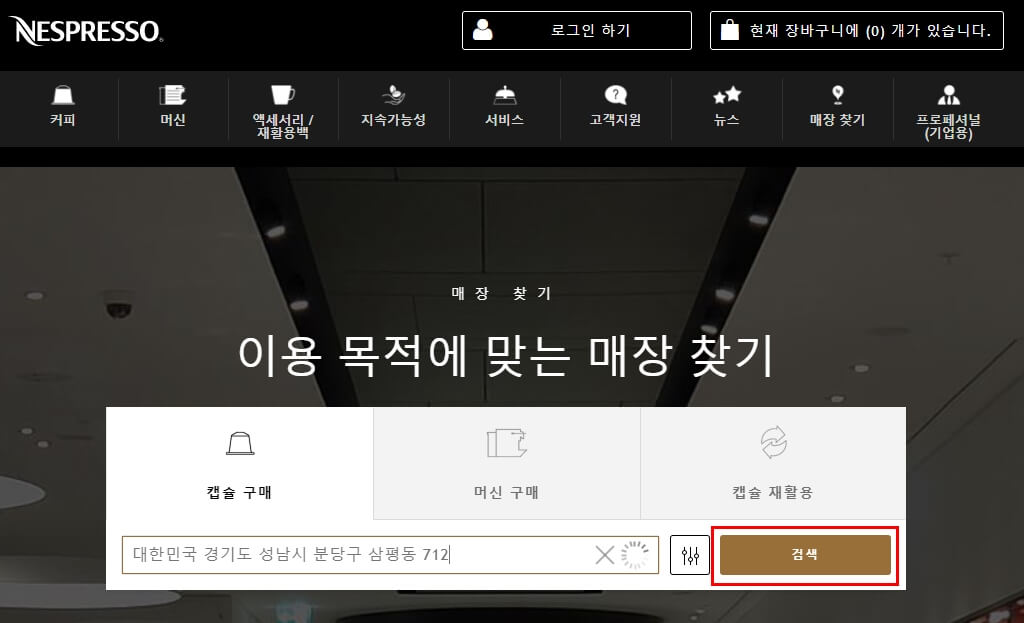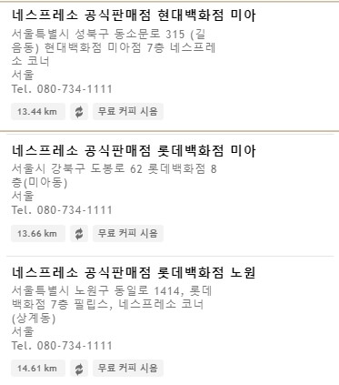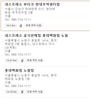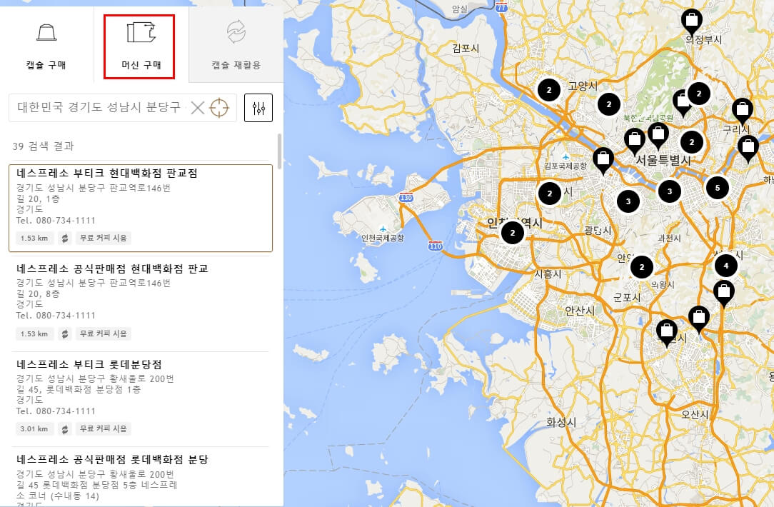 모든 매장이 동일한 서비스를 제공하고 있지는 않는것 같습니다. 만약 머신 , 캡슐을 구매할 계획이라면 해당 서비스에 맞는 매장을 찾아서 방문해야합니다. 머신 구매 버튼을 클릭해서 해당 서비스를 제공하는 업체를 찾아보세요.