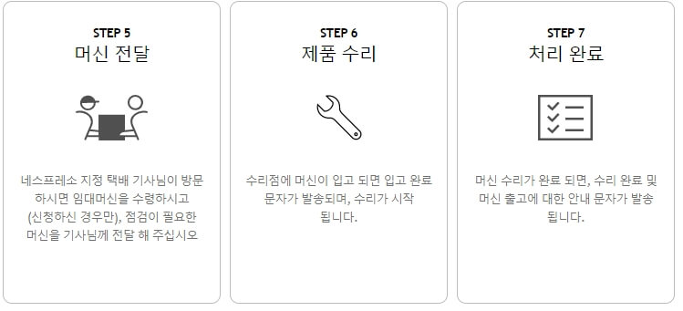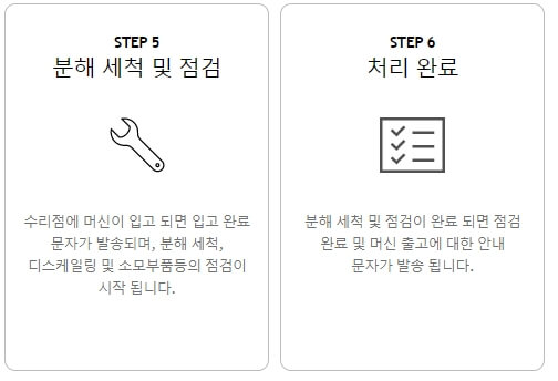 수거된 머신은 AS 기사님께 전달되고 제품 수리 단계를 수행하고 처리완료하여 최종적으로 고객에게 전달하는 과정을 가지고 있는 서비스 입니다. 단지 픽업 시 제품이 2차 고장이 발생하지 않도록 포장을 잘 해야겠죠.