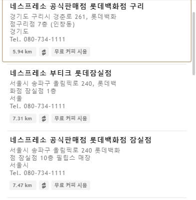 검색 범위에 주소를 도시의 "시"로 변경하면 더 넓은 범위에서 네스프레소 커피머신 매장을 검색해서 지도 UI 에서 확인할 수 있습니다. 방문 계획이 있다면 이동 경로를 고려하여 해당 매장 정보를 미리 확인하고 방문하세요.