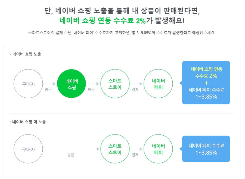 네이버 쇼핑에 노출하는 여부에 따라서 수수료에 변이가 상이하게 부여됩니다. 판매 발생에 유리한 부분이기 때문에 수수료 2%가 추가적으로 발생하여도 네이버 쇼핑 탭에 노출될 수 있도록 하는 것이 큰 이점이라고 판단됩니다.