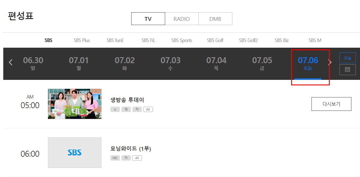 3. 시청 희망 날짜를 선택하시고, 원하는 재방송 프로그램을 확인하세요.