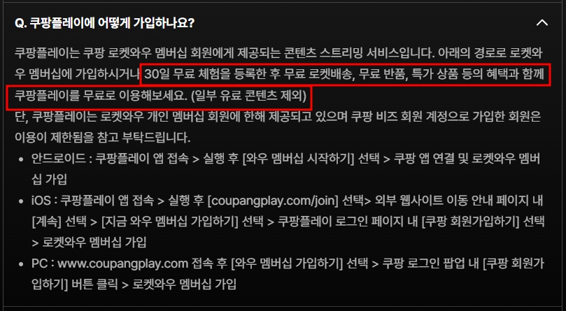 단, 쿠팡플레이는 로켓와우 개인 멤버십 회원에 한해 제공되고 있으며 쿠팡 비즈 회원 계정으로 가입한 회원은 이용이 제한됨을 참고 부탁드립니다.