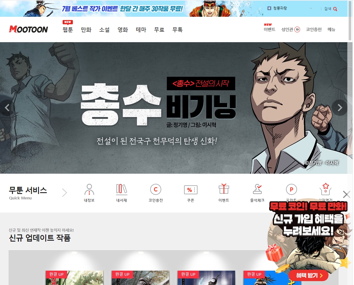 가장 궁금한 점은 바로 무툰 홈페이지를 무료로 최대한 많이 이용하는 방법이겠죠? 무료 코인! 무료 만화를 볼 수 있는 방법만 알고 있다면, 이점이 많죠! 자, 그럼 해당 무툰 홈페이지에서 무료 만화 보기 방법에 대해서 알아보겠습니다.