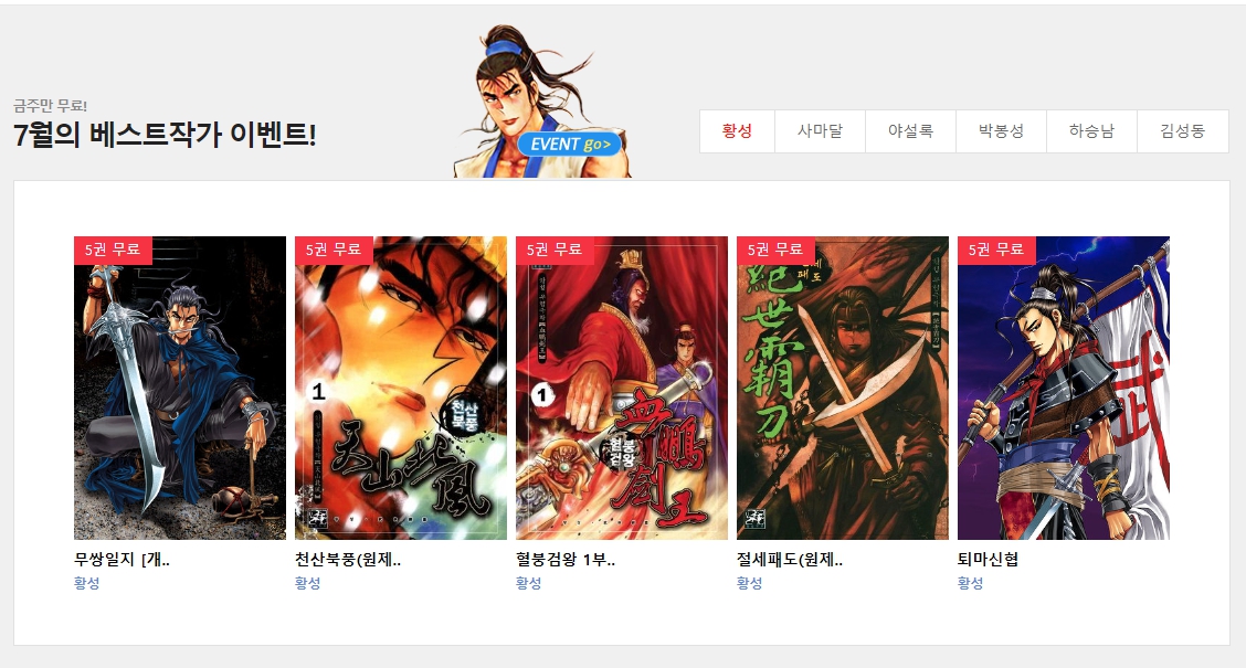 무협 만화에서 베스트 작가이벤트 서비스 영역이죠. 황성, 사마달, 야설록, 박봉성, 하승남, 김성 등 베스트 작가님에 콘텐츠를 5권씩 무료로 볼 수 있어요.