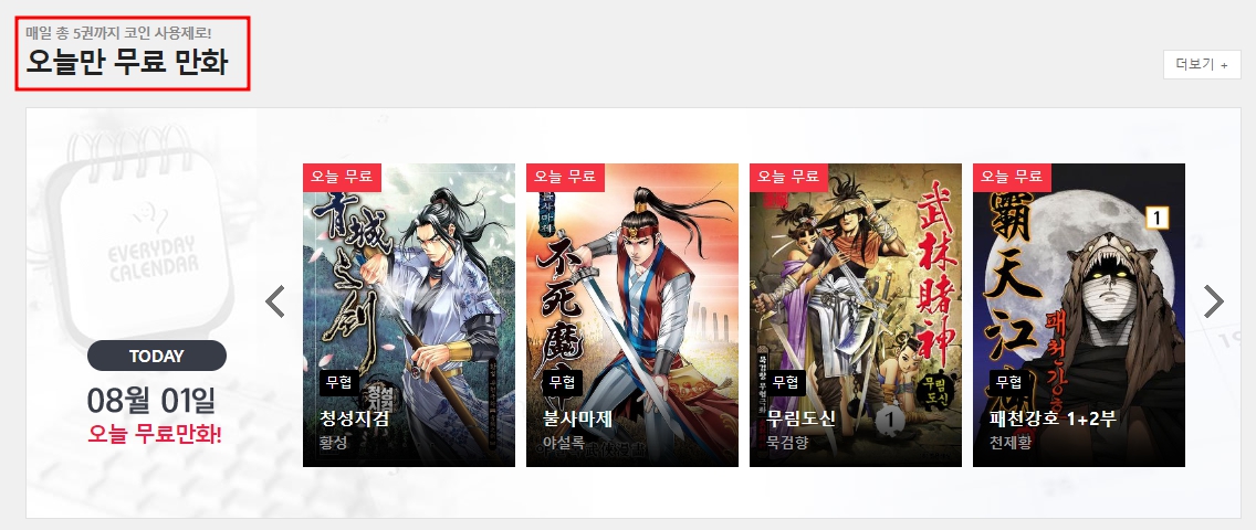 해당 영역은 매울 5권을 매일 무료로 볼 수 있도록 제공하는 서비스 영역입니다. 코인을 사용하지 않고 100% 무료로 볼수 있다는 의미죠!