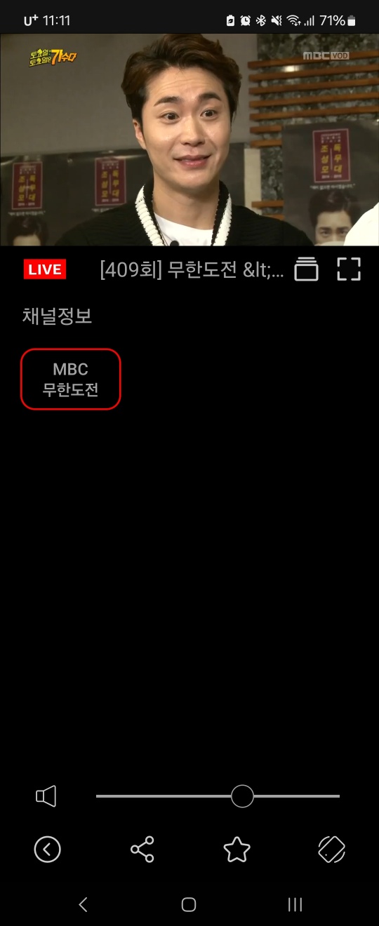 하필 좋아하는 409회 무한도전 토토가가 방송하고 있네요. 현재 화면은 세로로 구성되어 있지만 하단에 있는 설정 기능을 통해서 가로로 변경도 가능합니다. 해당 방송을 앞으로 자주 시청하길 희망하시면 별모양에 즐겨찾기를 선태해서 주기적으로 활용하는것도 좋은 방법이죠.