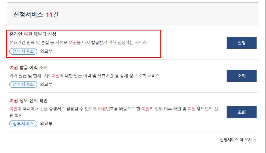 아래 정부 24에 여권 재발급 신청 하기 위한 경로를 공유드립니다. 혹시 온라인으로 여권 재발급 신청을 고려 중이라면 아래 링크를 활용하시면 됩니다.