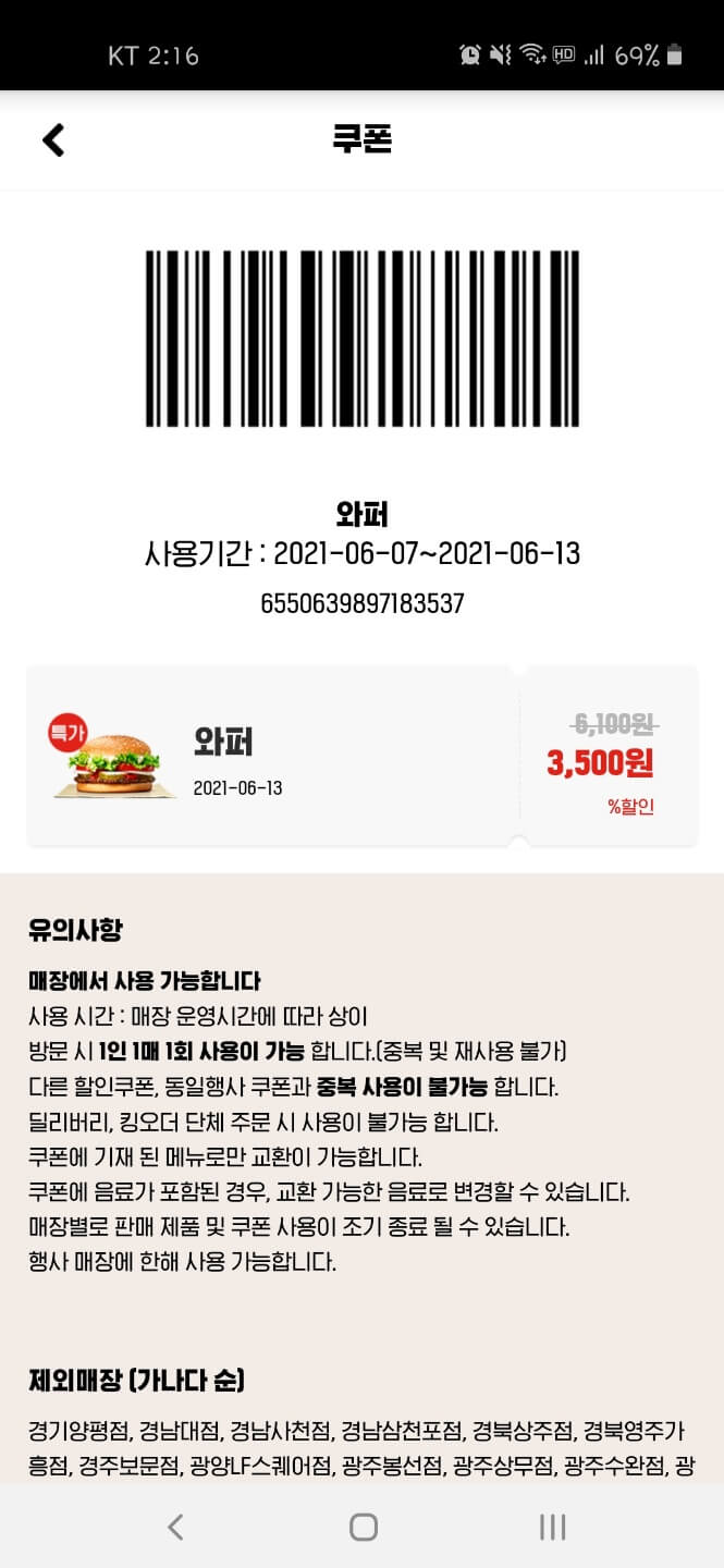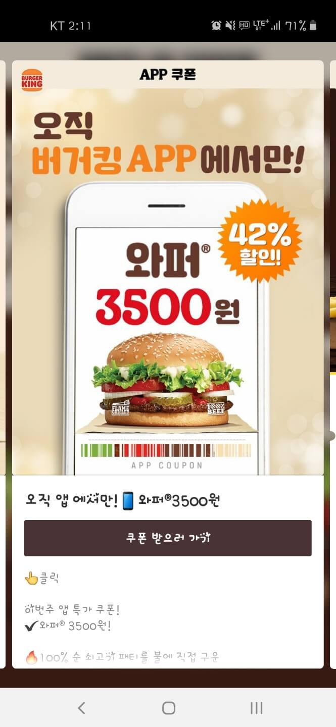 이와 같은 절차를 수행하는 경우, 맨달 버거킹 행사 정보 그리고 6월 행사로 어떤 제품이 할인 하고 있는지 알 수 있는 것은 기본이고 App 쿠폰가지도 받아 볼 수 있습니다. 다양한 쿠폰 중에서 이번달에 가장 눈에 들어 오는것은 와퍼가 3,500원에 판매하고 있는 쿠폰입니다. 할인률이 무려 42%나 되닌까요!