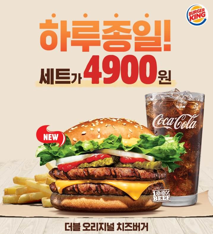 더블 오리지널 치즈버거, 직화소불고기버거, 콰트로치즈와퍼주니어, 통새우와퍼주니어 세트가 하루종일 4,900원 !