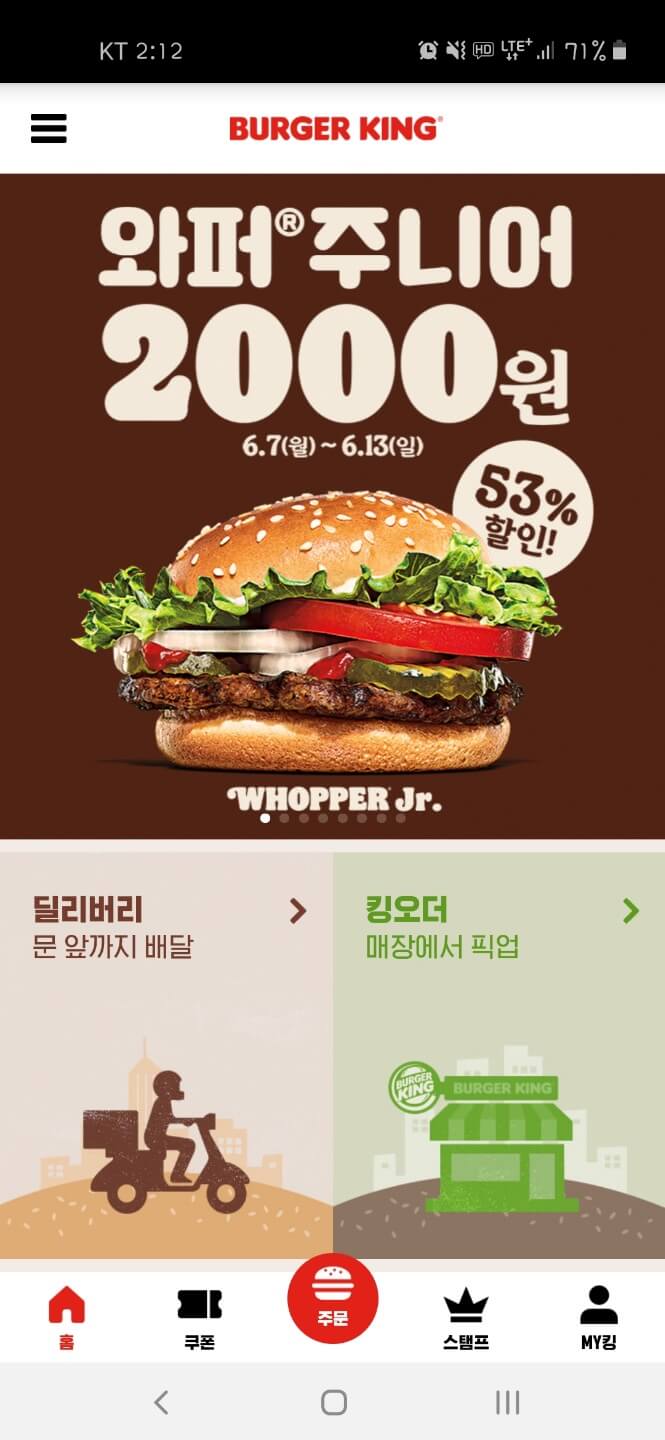 해당 쿠폰에 경우는 모바일 App 에서만 사용할 수 있기 때문에 버거킹 모바일 앱을 다운로드 및 설치를 해야합니다. 그리고 버거킹 App 을 실행하시면 다음과 같은 메인 화면을 확인 할 수 있습니다. 물로 매달 행사 쿠폰 뿐만아니라 스탬프를 받을 수도 있습니다.