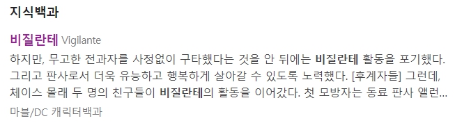 결과적으로는 "자경단"이라는 의미입니다. 이외에도 다양한 의미로 정의되어 있습니다. 게임 캐릭터, 웹툰 만화, 자경단, 등등으로 말이죠.