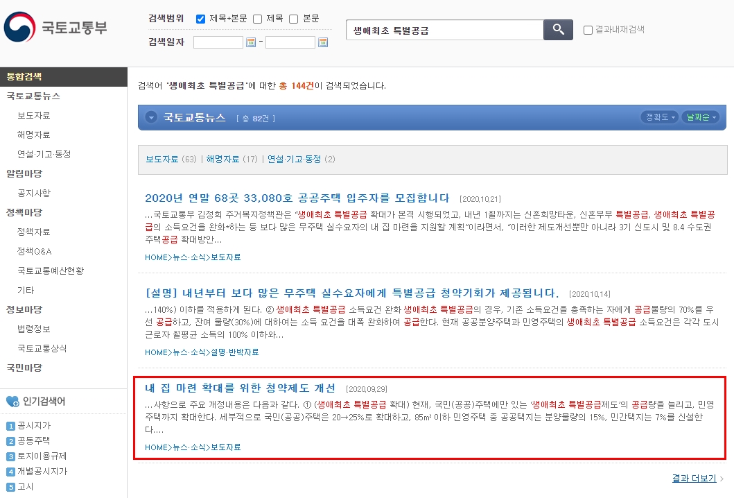 정확한 정보를 확인하기 위해서 먼저 국토교통부에서 명시한 생애 최초 특별 공급 조건 자료를 확인할 수 있는 경로를 확인해보겠습니다. 먼저 공식 홈페이지에 접속해주세요.