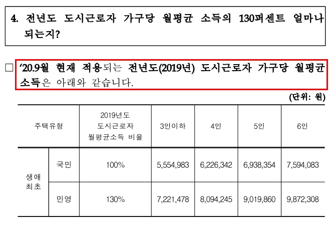 가장 이목이 집중되는 항목은 특별공급 소득기준이라고 할 수 있습니다. 신혼부부에 경우 맞벌이에 소득 기준이 기존에 비해서 확대 되어기 때문입니다. 그리고 해당 소득 기준을 판정하는 기준은 도시 근로자 월평균 소득을 기준으로 합니다.