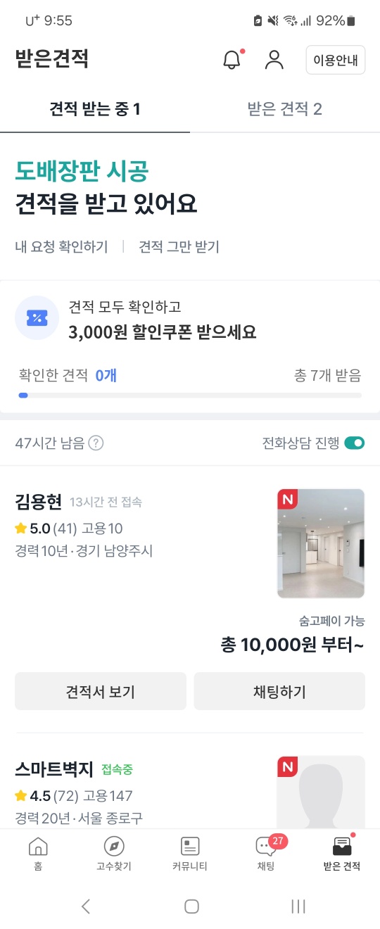 집 분위기 전환이 필요한데 도배 비용이 걱정되시나요? 숨고에서 무료로 맞춤 견적을 받아보세요. 다양한 전문가들의 견적을 비교하고, 합리적인 가격에 원하는 인테리어를 실현할 수 있습니다. 간편한 절차로 신뢰할 수 있는 도배 전문가를 만나보세요.