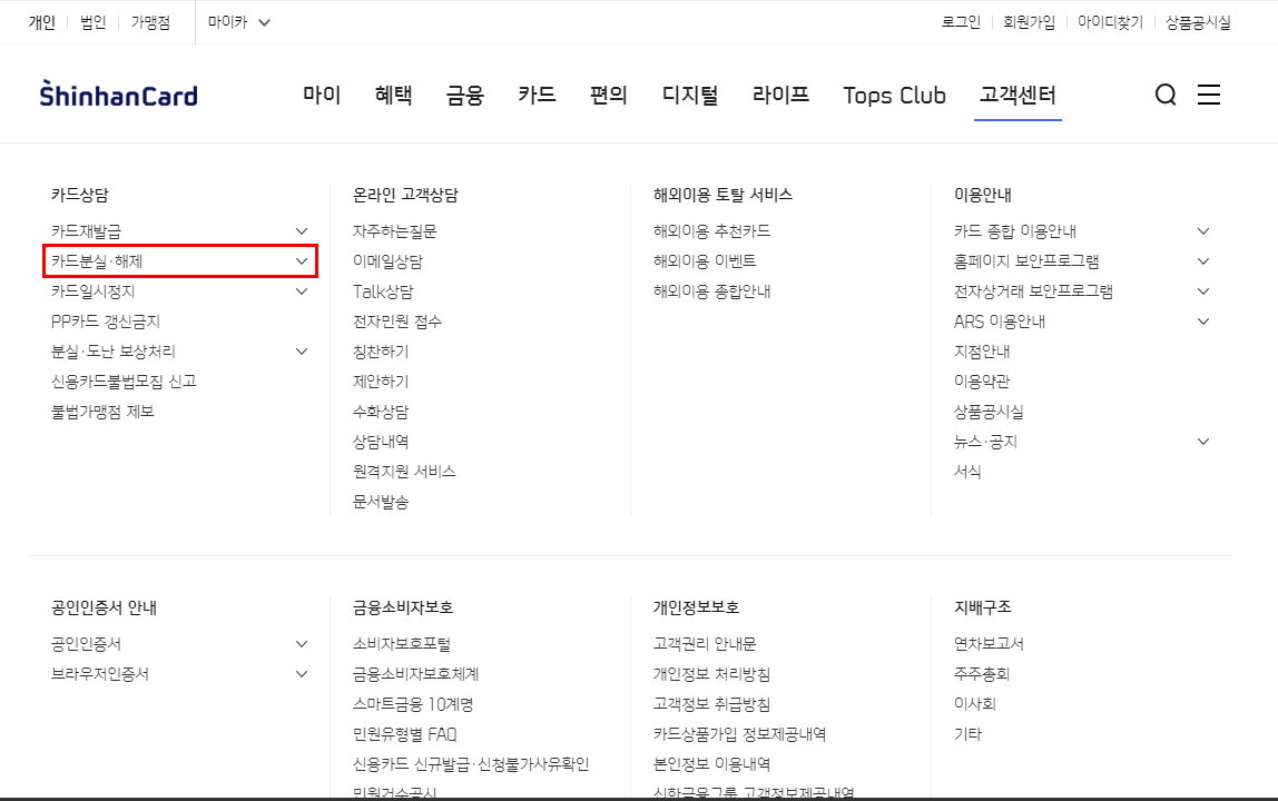 메뉴를 클릭하시면 다음과 같이 고객센터 상위 메뉴에 소속되어 있는 하위 메뉴들을 모두 확인 할 수 있습니다. 그 중에서 오늘 알아보려는 기능은 카드 분실 및 해제 방법이기 때문에 해당 메뉴를 선택해주세요.