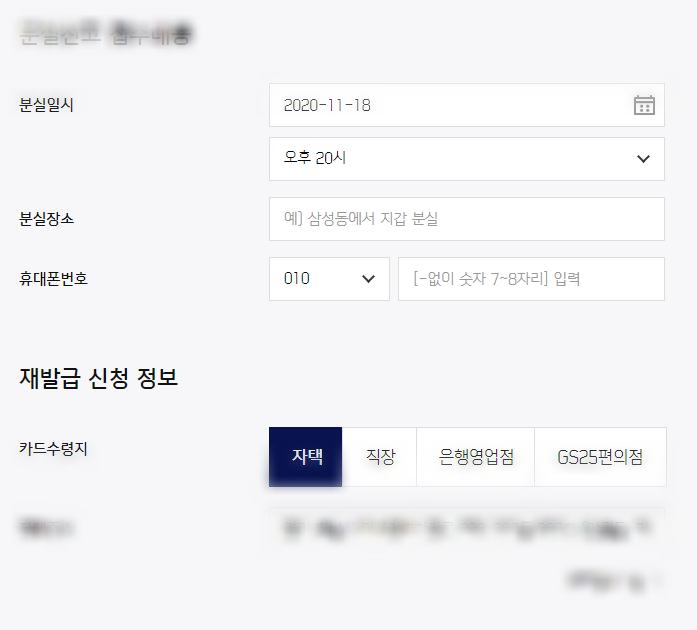 간단히 신한카드 분실 신고를 위한 접수 내용을 작성해주셔야합니다. 분실한 시점, 위치, 개인 휴대폰 번호와 같은 주요 정보를 입력해주셔야합니다. 그리고 마지막으로 재발급 신청 정보에 카드를 수령하기 위한 장소 정보까지 입력해주세요.