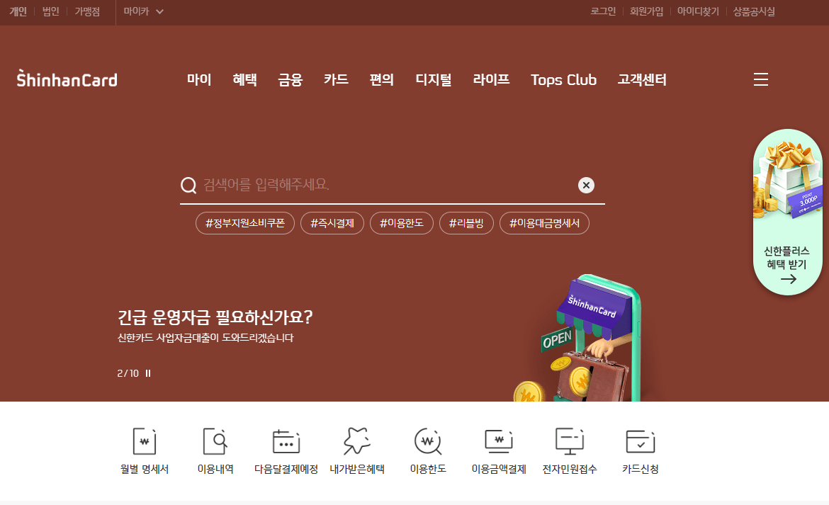 해당 사이트에 접속하시면 신한카드와 관련된 다양한 온라인 서비스는 물론 신한 카드와 고련된 고객 서비스도 이용 할 수 있는 유용한 공식 홈페이지 입니다. 신한카드를 주로 거래하시는 분이라면 공식 모바일 App 으로도 수행이 가능할것으로 보입니다.