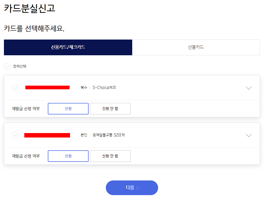 소유하고 있는 카드 중에 분실 한 카드를 선택하고 "다음"버튼을 클릭하시면 됩니다. 분실 신고와 동시에 재발급 신청까지 수행 할 수 있도록 편의 기능을 제공하고 있는 신한카드 고객센터에 감사합니다.
