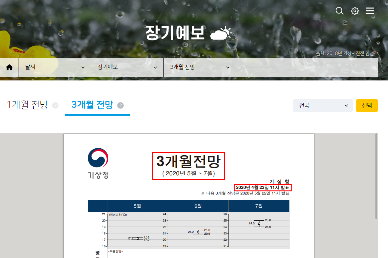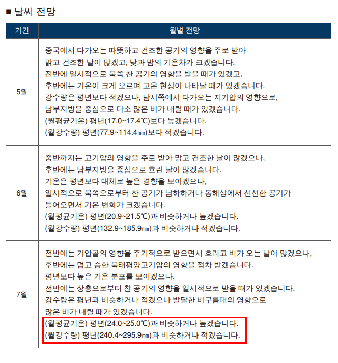 소문으로만 들었던, 올해는 작년보다 덥다, 올해 장마철 기간이 길 수 있다는 소문들이 이 정보를 기반으로 나오지 않았나 싶네요. 장기 예보 전망으로 올해는 평년보다 기온이 높고, 강수량의 편차가 크다고 합니다.