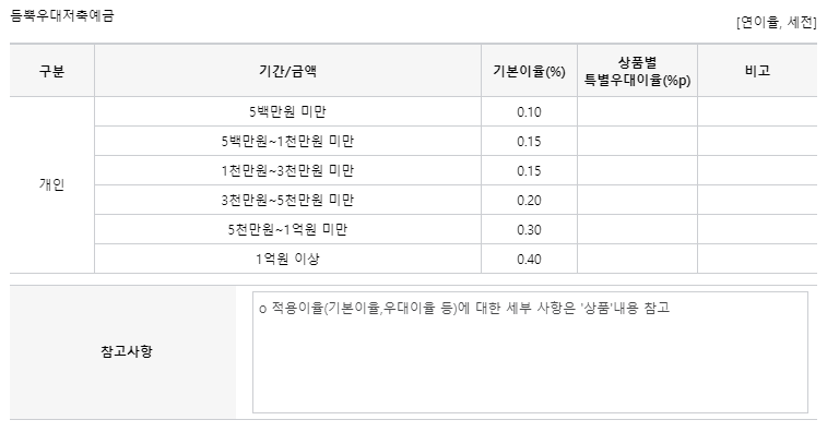 해당 페이지에 가면 상품 별로 기본 이율과 금액별 예금 금리를 확인 할 수 있습니다. 확실히 예금 금액이 높아지면 금리 또한 증가하는 것으로 보입니다.