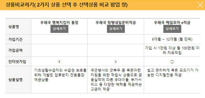 비교하고 싶은 상품을 선택하여 다음과 같이 항목별로 확인 할 수 있습니다. 우체국 장병관련 예금 상품이 금리가 상당히 높았습니다.