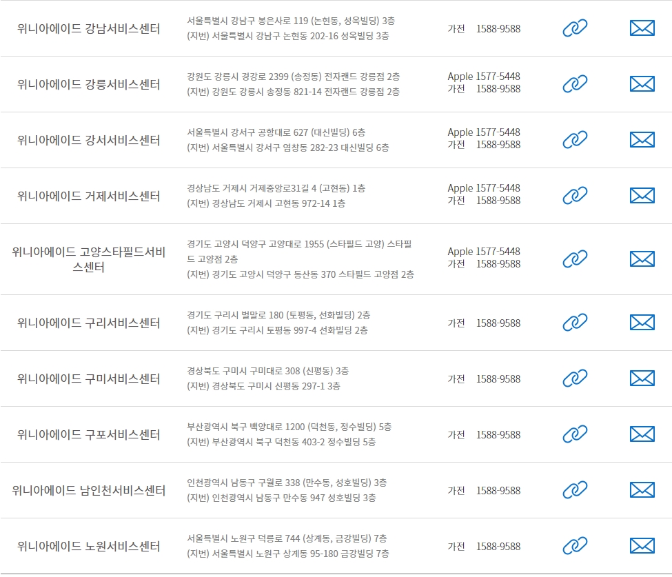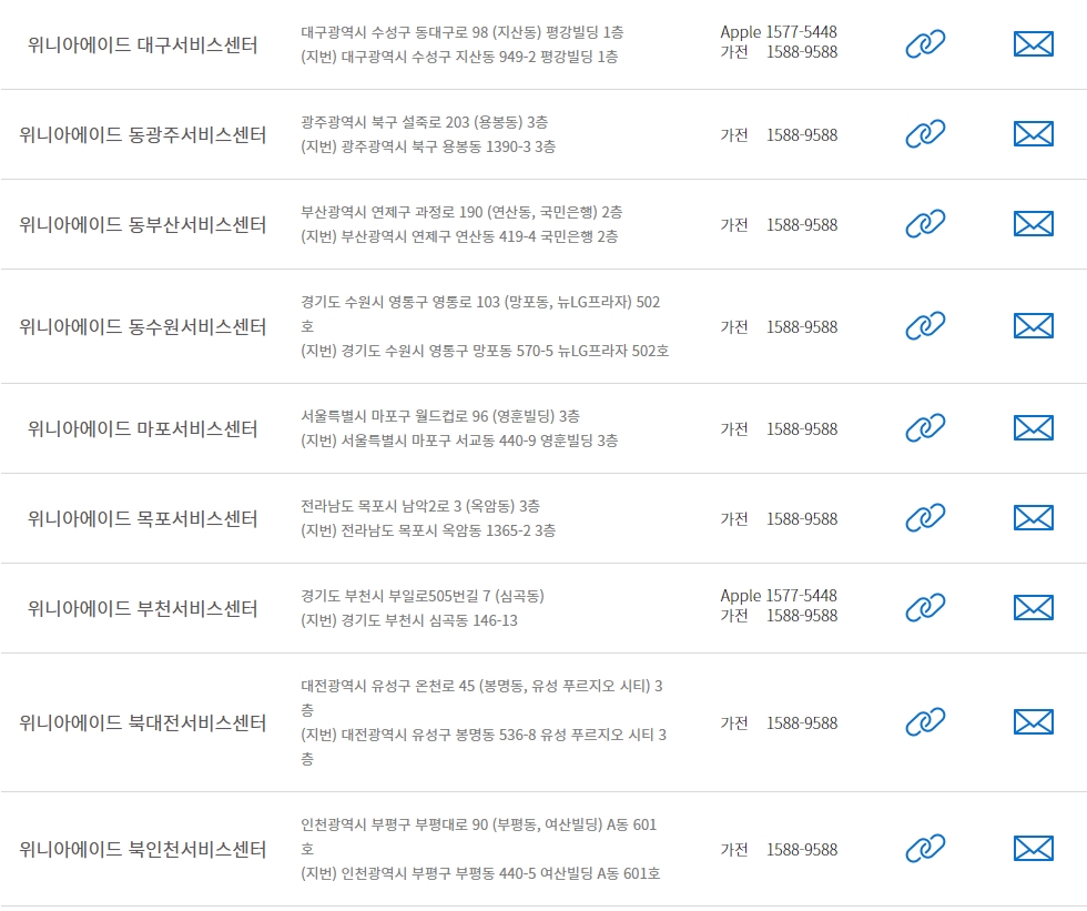 해당 메뉴를 통해서 지역별로 위니아 공식 AS 서비스 센터를 찾기하고 세부적인 센터에 정보를 확인 후에 해당 센터에 방문해서 문제점을 해결하면 되지 않을까 싶습니다.