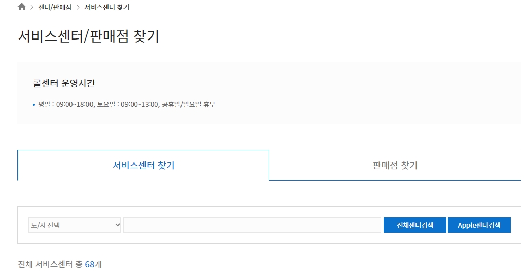 서비스 센터/판매점 찾기 메뉴를 통해서 본인이 방문을 희망하는 지역을 검색어로 입력하고 검색 기능을 활용하면 간편하게 원하는 정보를 찾을 수 잇습니다.