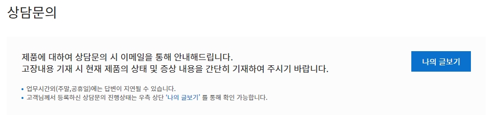 공식 홈페이지를 통해서 AS 상담 문의를 접수하는 방법에 대해서 알아보겠습니다. 최근에는 고객센터에서 챗봇 서비스를 도입하여서 손 쉽게 AS 접수를 받는 경우가 많아지고 있는데, 위니아 에이드는 아직 홈페이지 게시물 작성 방법을 통해서 접수받고 있네요.