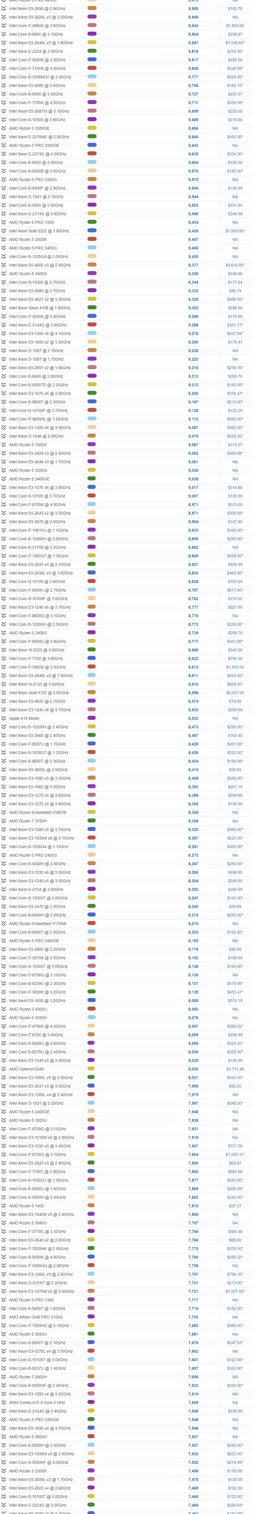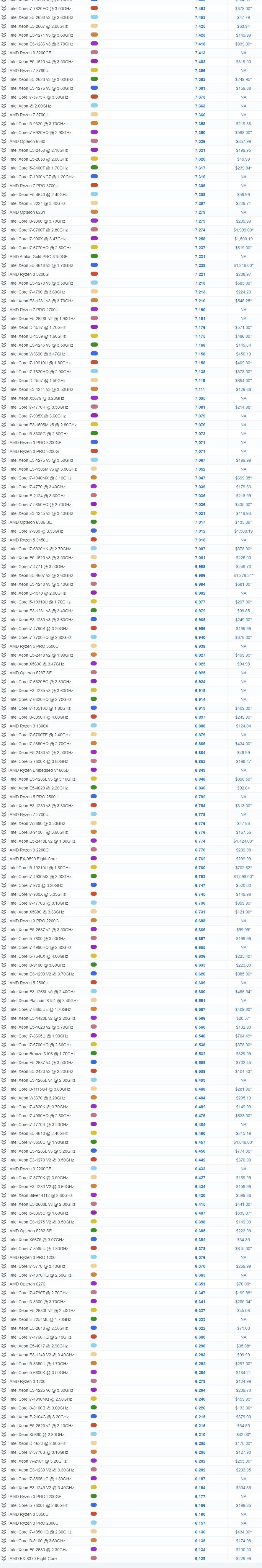 | 74 | Intel Core i9-7980XE @ 2.60GHz | 29,471 | $899.86 |