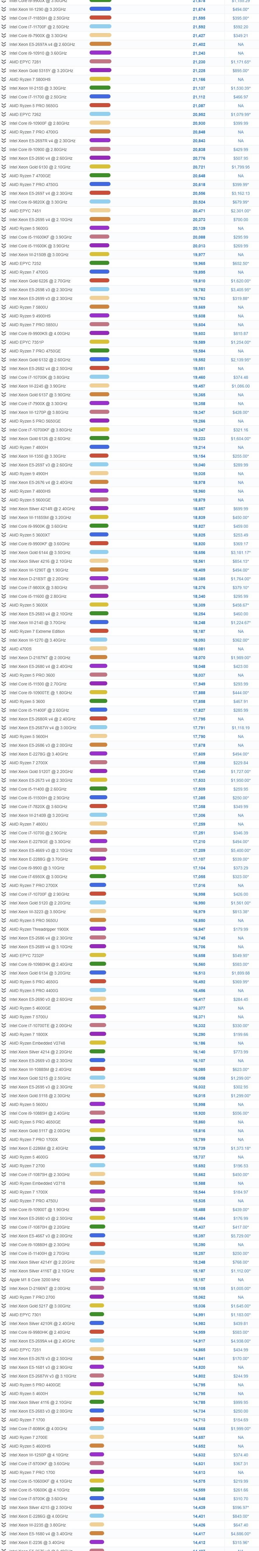 | 44 | Intel Core i9-10980XE @ 3.00GHz | 33,847 | $1,060.38 |