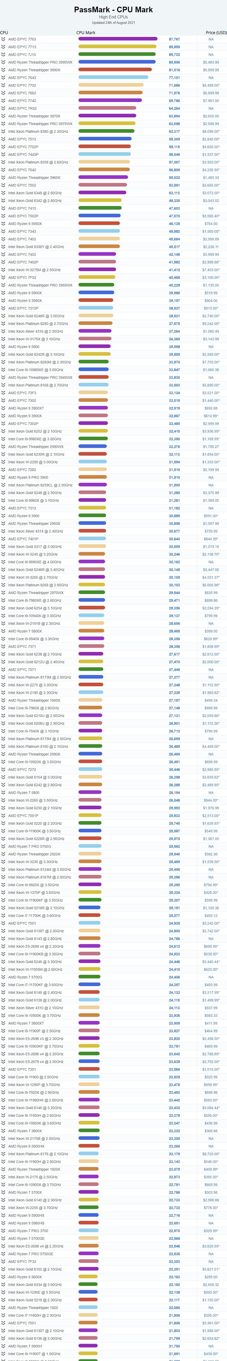 44 | Intel Core i9-10980XE @ 3.00GHz | 33,847 | $1,060.38 |