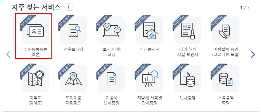 자주 찾는 서비스 영역에 있는 메뉴 또는 검색어를 입력해서 해당 메뉴를 찾을 수 있습니다. 많은 분들이 활용하는 기능이기 때문에 주로 메인 화면에 노출됩니다. 메인 화면에 있는 주민등록등본(초본) 메뉴를 클릭해주시면, 해당 상세 화면으로 이동합니다.