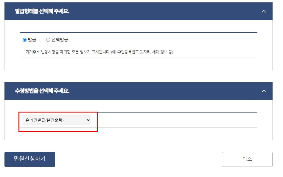 여기서 중요한 부분은 온라인발급(본인출력)을 선택하는 것입니다. 물론 종이가 필요한 경우, 해당 컴퓨터와 프린터가 연결되어 있어야 합니다.