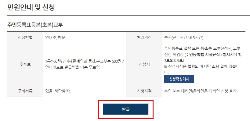 해당 내용에서는 주민등록등본은 인터넷으로 발급받을때는 무료임!으로 표기되어 있습니다. 또한 처리 기간이 즉시이기 때문에 바로 등본 정보를 확인하고 출력, PDF 파일 저장까지 가능합니다. 아래 "발급" 버튼을 클릭해주세요.