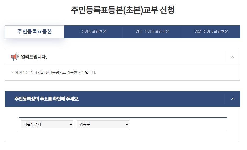주민등록등본(초본) 메뉴를 선택해주세요.
